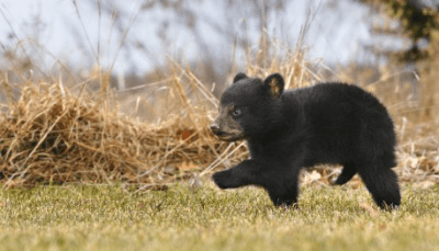 A bear cub scampers in the grass.