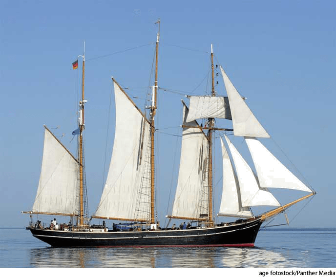 1. Nautical A fore-and-aft rigged sailing vessel with at least two masts, a foremast, and a mainmast stepped nearly amidships.【航海】 纵帆船:一种纵帆装置的航船,至少有二根桅杆,一根前桅,在靠近船的中部有一根主桅杆