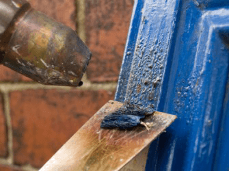A person scrapes blue paint off a cupboard door.