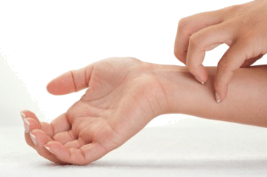 A woman scratches her wrist.