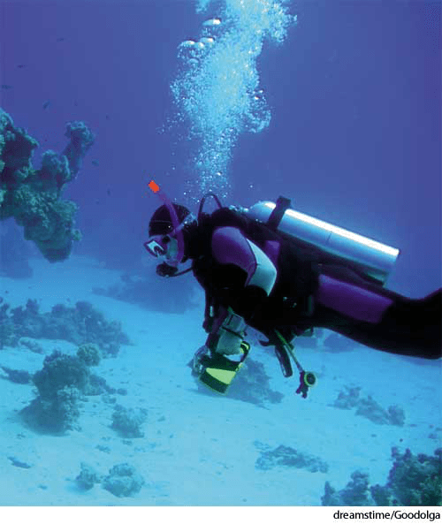 用水肺潜水的人:在水下游泳时使用水下呼吸器的人