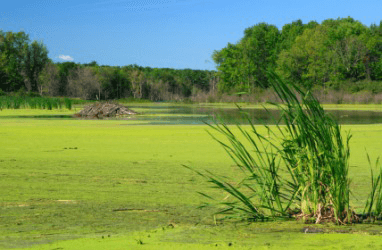 A pond covered with scum.