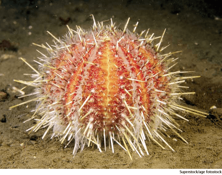 sea urchinn.(名词) sea urchinwhite sea urchinGracilechinus acutus- Any of various echinoderms of the class Echinoidea, having a soft body enclosed in a round, symmetrical, calcareous shell covered with long spines.海胆:任一种棘皮纲的棘皮动物,具有被圆形对称的螺旋状贝壳包含的柔软躯体,贝壳表面布满棘刺