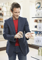 Barry tested several colognes at the mall to find the one that might help seduce his dinner date that evening.
