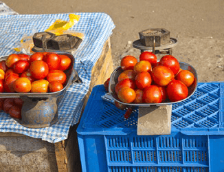 The produce vendor uses a seer to calculate the weight of tomatoes at a market in Ernakulam, India.