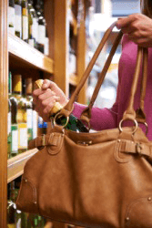 A woman shoplifts a bottle of wine.