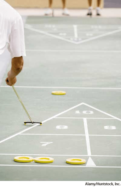 shuf·fle·board AHD[shŭfʹəl-bôrd', -bōrd'] D.J.[ˈʃʌfəlˌbɔːd, -ˌbəʊrd]K.K.[ˈʃʌfəlˌbɔrd, -ˌbord]n.Games(名词)【游戏】 shuffleboard- A game in which disks are slid with a pronged cue along a smooth, level surface toward one of two usually triangular targets painted on the surface and divided into numbered scoring areas.打圆盘游戏:一种游戏,用带尖角的弹子棒击打圆盘,使其沿着一光滑、水平的表面滑向一个或两个通常为三角形的被绘在平面上且分成标有数码的得分区的目标物