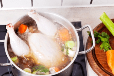 A chicken simmers in a pot.