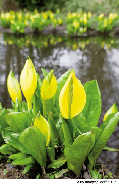 - A western North American plant(Lysichitum americanum) having a bright yellow spathe with an inflated upper part. 臭菘属植物:北美洲西部的植物(臭菘) ,有上部膨胀的黄色显眼的佛焰苞