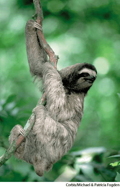 1. Any of various slow-moving, arboreal, edentate mammals of the family Bradypodidae of South and Central America, having long hooklike claws by which they hang upside down from tree branches and feeding on leaves, buds, and fruits, especially:树懒:生活在美洲中部和南部的树懒科哺乳动物之一,移动缓慢,栖息在树上,无齿目,爪子长而有钩,它们用爪子倒悬在树枝上,吃树叶、嫩芽和果实,尤指: