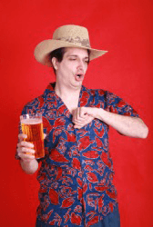 A man belching after a drink of beer.