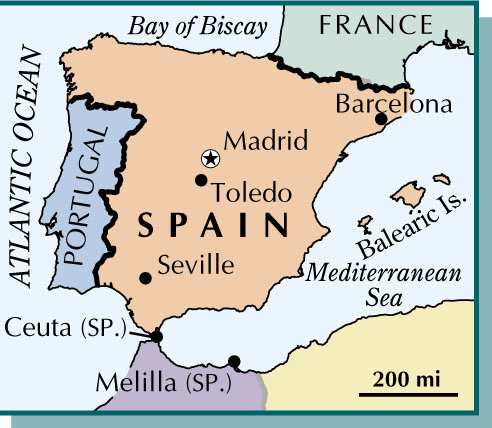 Spain AHD[spān] D.J.[speɪn]K.K.[spen]NONE(无词性) - A country of southwest Europe comprising most of the Iberian Peninsula and the Balearic and Canary Islands. Inhabited since the Stone Age, the region was colonized by Phoenicians and Greeks and later ruled by Carthage and Rome (after 201b.c. ). Barbarians first invaded Spain in a.d. 409 but were supplanted by Moors from North Africa (711-719), who organized a kingdom known for its learning and splendor. The Moors were gradually displaced by small Christian states and were ousted from their last stronghold, Granada, in 1492. Ferdinand of Aragon and Isabella of Castile then became rulers of a united Spain, which became a world power through exploration and conquest. After the empire was lost in the 18th and 19th centuries, Spain experienced social and economic unrest that culminated in the Spanish Civil War (1936-1939) and the rise of Francisco Franco. Madrid is the capital and the largest city. Population, 38,872,389. 西班牙:欧洲西南部一国家,由伊比利亚半岛大部分、巴里阿里群岛和加纳利群岛组成。从石器时代开始这里就有人居住,该地区先是成为腓尼基人和希腊人的殖民地,后被迦太基人和罗马人统治(公元前 201年以后)。野蛮人于 公元 409首次入侵西班牙,但后来被来自北非的摩尔人取代(711-719年),摩尔人建立了一个博学和辉煌的王国。后来摩尔人逐渐被基督教小国代替,并最终于1492年被逐出他们的堡垒-格拉纳达,而后阿拉贡的斐迪南和卡斯提里亚的伊莎贝拉成为西班牙的统治者,他们通过扩张和征服成为世界强国。该帝国在18世纪和19世纪没落以后,西班牙国内社会、经济上的动荡最终导致了西班牙内战(1936-1939年)和弗朗西斯科·佛朗哥的崛起。马德里是其首都和最大城市。人口38,872,389