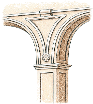 - The space between two arches and a horizontal molding or cornice above them.拱距:在两个拱形和水平角线或其上面的飞檐之间的距离