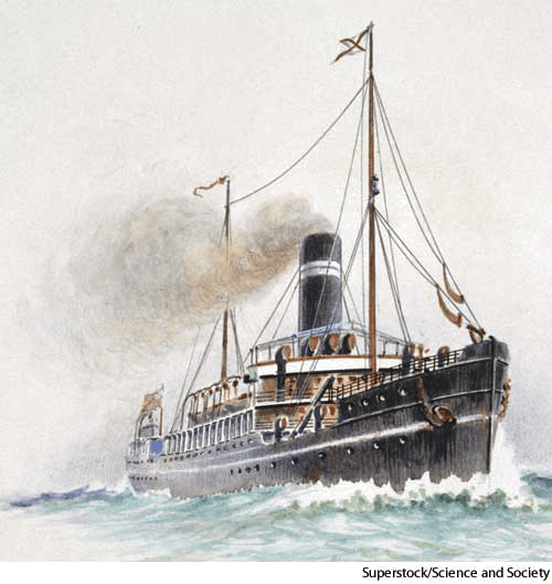 A large vessel propelled by one or more steam-driven screws, propellers, or paddles.