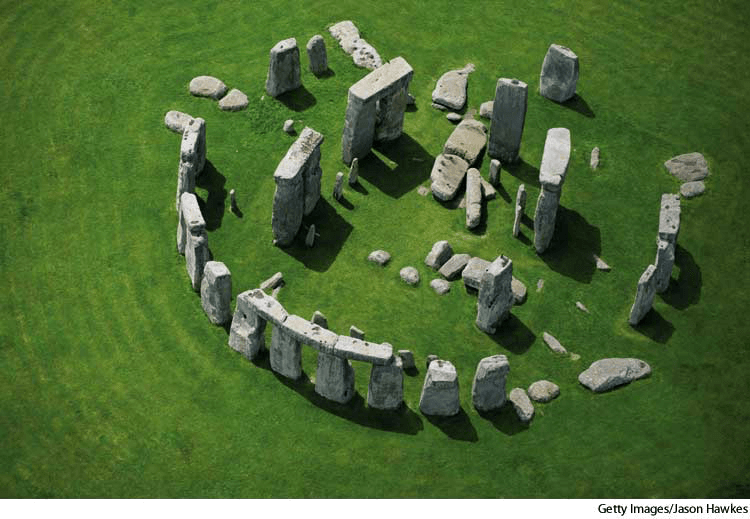 Stone·henge AHD[stōnʹhĕnj'] D.J.[ˈstəʊnˌhendʒ]K.K.[ˈstonˌhɛndʒ]NONE(无词性) Stonehengeaerial photograph- A group of standing stones on Salisbury Plain in southern England. Dating to c. 2000-1800b.c. , the megaliths are enclosed by a circular ditch and embankment that may date to c. 2800. The arrangement of the stones suggests that Stonehenge was used as a religious center and also as an astronomical observatory. 巨石阵:英格兰南部索尔兹伯里的直立石柱群,可追溯到公元前 2000-1800年的巨石被约存于公元前2800年的圆形沟渠和石堤围住。巨石的排放位置表明当时巨石阵为宗教中心,也被用作星象观测台