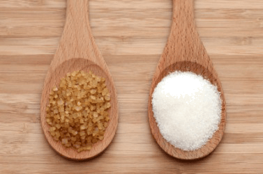 Spoons full of brown and white sugar.