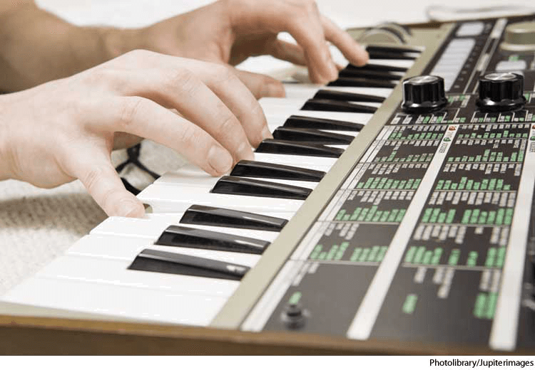 - Music An electronic instrument, often played with a keyboard, that combines simple waveforms to produce more complex sounds, such as those of various other instruments.【音乐】 音响合成器:一种电子乐器,常用一键盘演奏,它把简单的波形合在一起以便产生复杂的音响,如其它各种乐器的音响