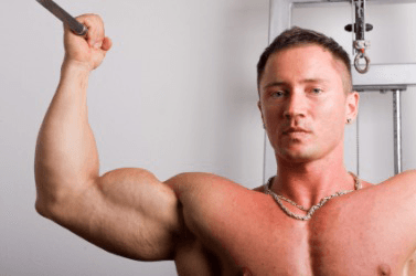 A man flexes his biceps.