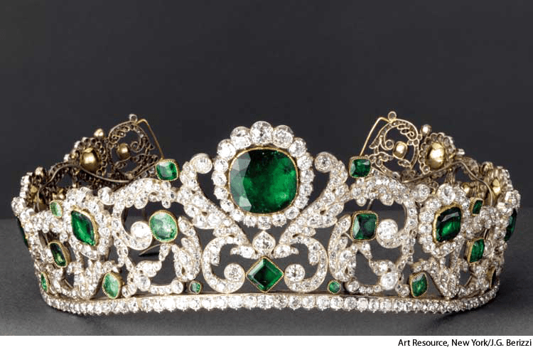 ti·ar·a AHD[tē-ărʹə, -ârʹə, -ärʹə] D.J.[tiːˈærə, -ˈeərə, -ˈɑːrə]K.K.[tiˈærə, -ˈɛrə, -ˈɑrə]n.(名词) tiarac. 1820 tiara by Jacques-Evrard and Christophe-Frédéric Bapst, made for the Duchess of Angoulême, daughter of Louis XVI of France- An ornamental, often jeweled, crownlike semicircle worn on the head by women on formal occasions.古波斯人头巾:妇女在正式场合戴在头上的一种通常镶有珠宝且像王冠一样的半圆形装饰物