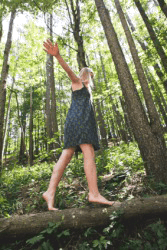 A girl walks tiptoe across a log.