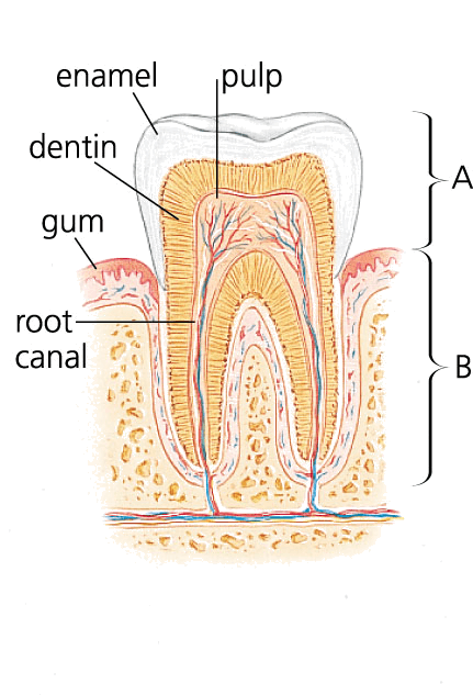 1. One of a set of hard, bonelike structures rooted in sockets in the jaws of vertebrates, typically composed of a core of soft pulp surrounded by a layer of hard dentin that is coated with cement or enamel at the crown and used for biting or chewing food or as a means of attack or defense.牙,齿:脊椎动物上下颚的槽臼中扎根的一排坚硬,骨状物体,典型的结构是中间为一软体,后面包围着一层坚硬的牙本质,牙本质外为一由钙质或采釉质组成的牙冠,牙齿可用来撕咬或咀嚼食物,还可用作进攻或防御的工具