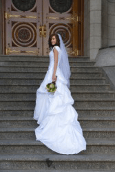A bride wears a dress with a long train.