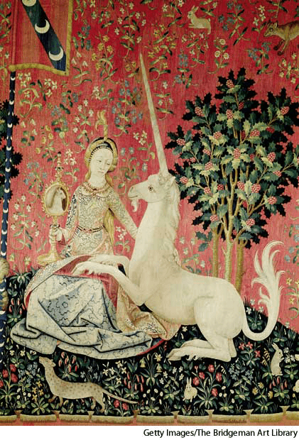 释义 u·ni·corn AHD[yo͞o′nĭ-kôrn'] D.J.[ˈjuːnɪˌkɔːn]K.K.[ˈjunɪˌkɔrn]n.(名词)unicornThe Lady and the Unicorn: "Sight,"one in a series of six 15th-century tapestries