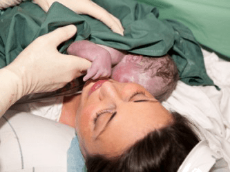 A woman holding her baby just after giving birth.