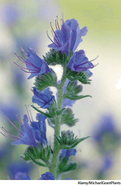 vi·per's bugloss AHD[vīʹpərz] D.J.[ˈvaɪpəz]K.K.[ˈvaɪpəz]n.(名词) viper's buglossEchium vulgare- Any of various Eurasian plants of the genusEchium, including the blueweed, having bright blue to white flowers, bristly foliage, and a dense scorpioid inflorescence. 蓝蓟:产于欧亚大陆的蓝蓟 属植物的一种,包括蓝蓟,有明蓝色到白色的花朵,叶子有刺,具有密集的蝎尾状的花簇