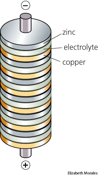 伏打电堆:一种电源,由被酸液浸湿的垫片分隔的两种不同金属交互片组成,连成一组形成原电池