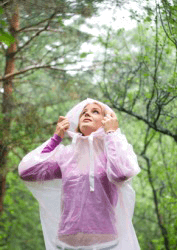 A woman wears a waterproof raincoat.