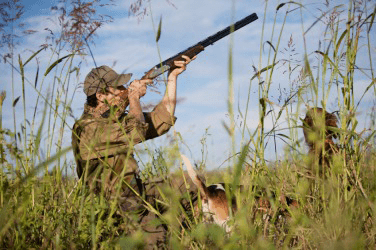 This hunter is using a gun as his weapon.