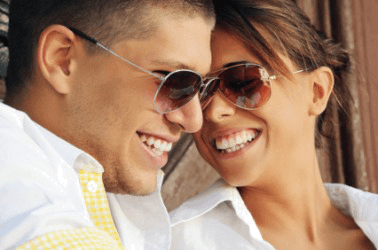 A man and a woman wear sunglasses.