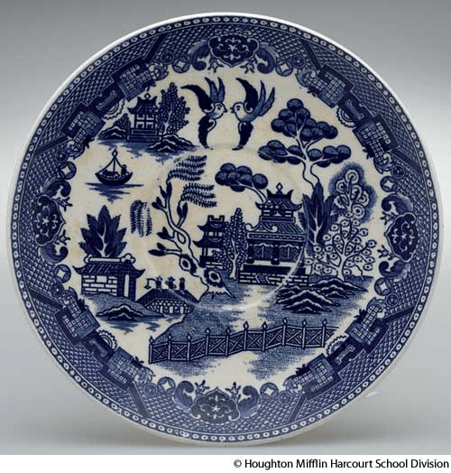 Household china decorated with a blue-on-white design depicting a willow tree and often a river.