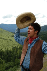 A cowboy yells,