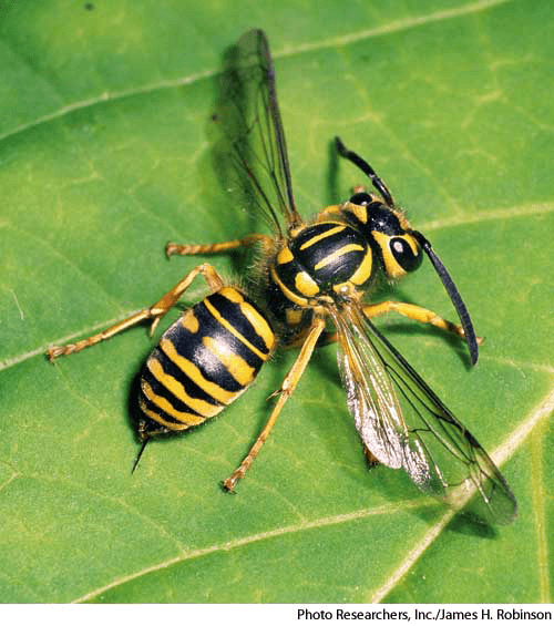 黄色胡蜂:胡蜂科中的一种群居小胡蜂,长有黄色和黑色的花纹,通常在地下或树洞里做巢