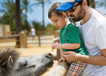 A father and son at the zoo.