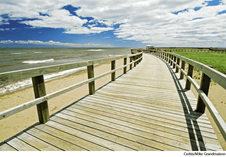 - A promenade, especially of planks, along a beach or waterfront.木板路:沿海滩或水边用木板铺成的宽阔人行道