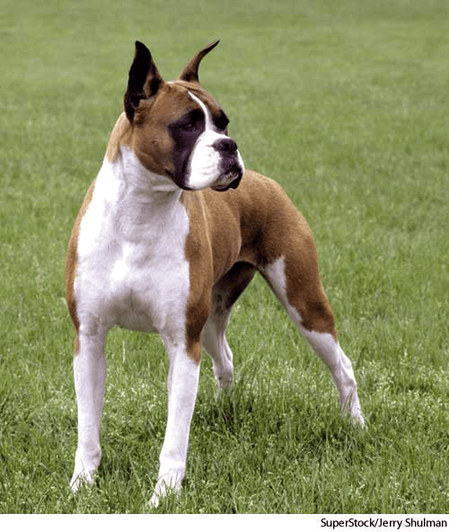 - from English boxer 1 [from its pugnacious nature] 源自 英语 boxer1 [因其好斗性而得名]
