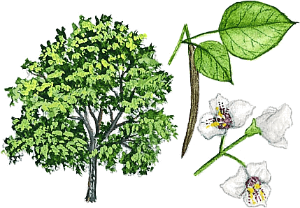 ca·tal·pa AHD[kə-tălʹpə, -tôlʹ-] D.J.[kəˈtælpə, -ˈtɔːl-]K.K.[kəˈtælpə, -ˈtɔl-]n.(名词) Southern catalpaCatalpa bignonioidesWendy Smith- Any of various, usually deciduous trees of the genusCatalpa, especially C. bignonioides or C. speciosa, native to the United States and having whorled, heart-shaped leaves, showy clusters of white flowers, and long, slender, cylindrical pods. Also called Indian bean 梓树:一种通常落叶的梓属 树木,尤指 比格诺滕梓属 或 美丽梓属 ,原产美国,有轮生的心形叶子、绚丽的白色花簇和细长的圆柱形豆荚 也作 Indian bean
