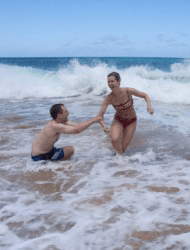 Two people cavorting in the waves.