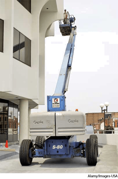 移动升降台:一种可移动的具有可调的垂直支臂的升降台架,人可站在顶部做剪树枝和修路灯等工作