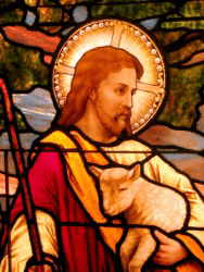 A depiction of Jesus Christ in stained glass.