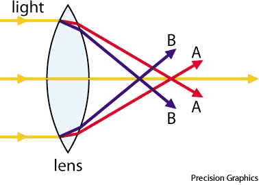 色像差:由透镜成像造成的色彩畸变,因为透镜不能将各种色光聚焦在一点上