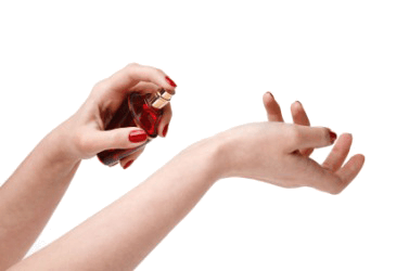 A woman applying cologne.