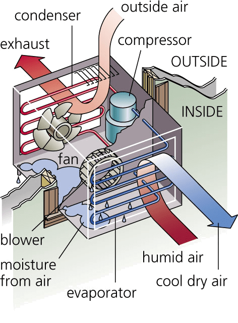 空气调节器,空调设备:用来控制,尤其是降低一个封闭空间的温度和湿度的设备