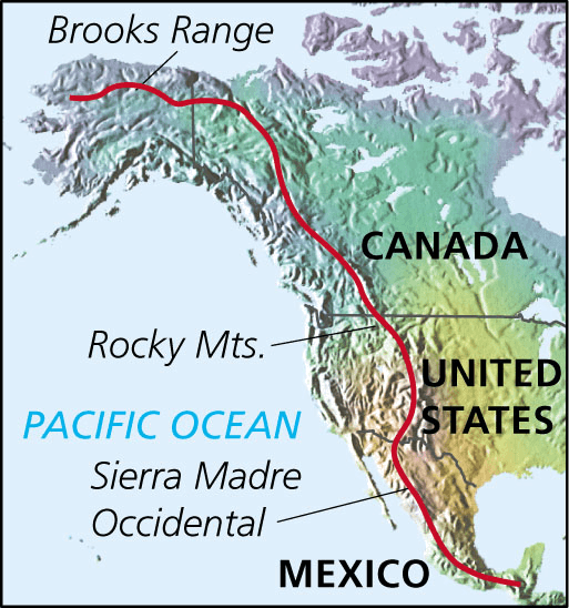 1. A series of mountain ridges extending from Alaska to Mexico that forms the watershed of North America. Most of it runs along peaks of the Rocky Mountains and is often called theGreat Divide in the United States. 北美大陆分水岭:从阿拉斯加延伸到墨西哥的一系列山脊,它构成北美大陆的分水线。其中大部分沿落基山脉的山峰分布,在美国常被称为大分水岭