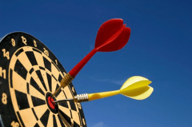 Two darts stuck in a dartboard.