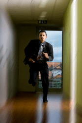 A man dashes down the hall.
