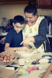 A mother demonstrates cooking.